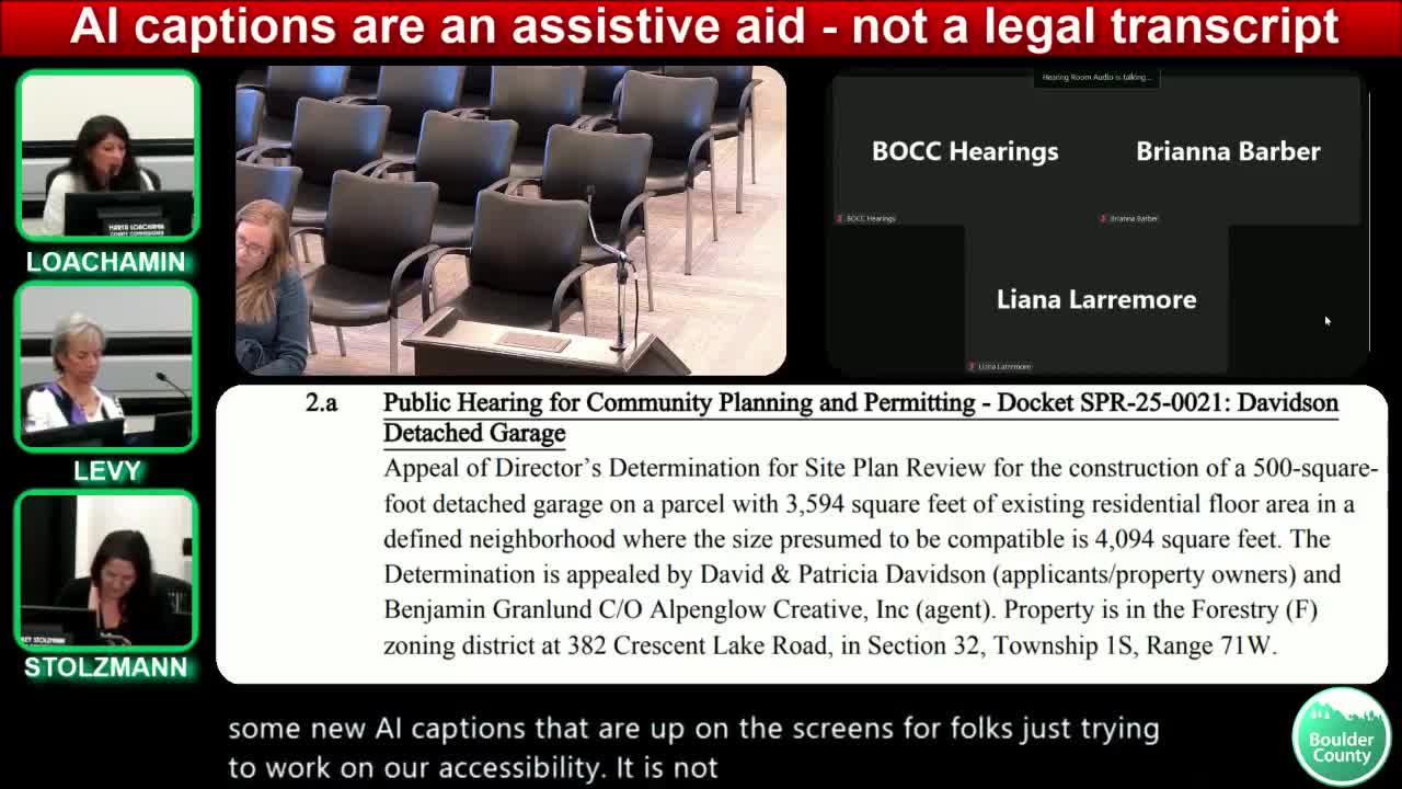 Docket and code references: SPR‑25‑0021 (Davidson detached garage); director’s determination issued March 18, 2025; applicant appeal filed March 31, 2025; relevant provisions cited in the hearing include Article 4‑806 A2(b) of the Boulder County land‑use code regarding neighborhood compatibility and mitigation of visibility impacts.