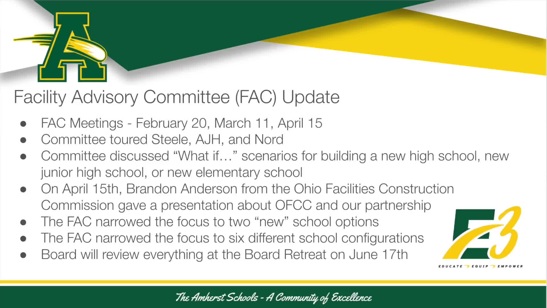 Facilities advisory committee members reported three recent building tours and said they had narrowed possible configurations for a new high school and elementary options to six different configurations; the OFCC representative said he would evaluate each option for compliance and return with potential cost estimates. Administration said Amherst is about 14th in line for state funding through OFCC, and noted that state timing could be two to five years or longer, depending on funding and the queue of projects.