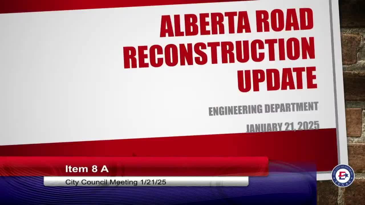 Edinburg — The City Council voted to direct staff to proceed with a median option for the Alberta Road reconstruction project at the Klausner intersection, after a detailed presentation from the city engineer, technical remarks from Texas Department of Transportation representatives and public comment from nearby business owners and residents.