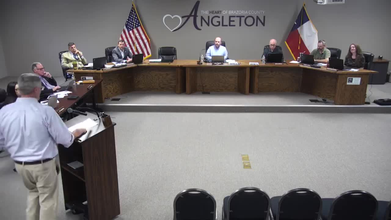 Matt Hanks, identified in the meeting as the county engineer, told the Angleton City Council that Brazoria County’s current interlocal street program generally provides two miles of overlays for cities and that the county has adjusted policy to reduce repeated mobilizations and improve project efficiency. Hanks said the county now typically asks for up to four locations (not necessarily four discrete streets) totaling two miles to avoid excessive mobilization costs.