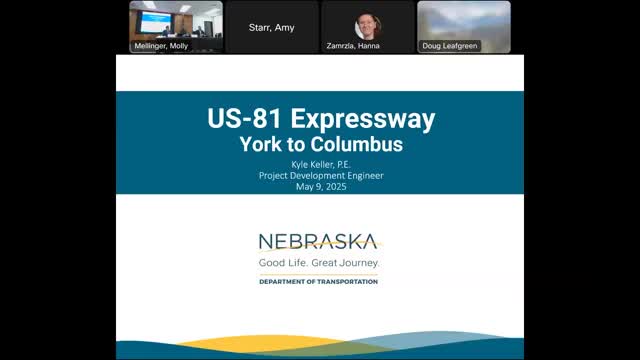 The Nebraska State Highway Commission voted to recommend governor approval of a 40‑plus mile US‑81 expressway corridor from north of York to south of Columbus, endorsing a 2+2 four‑lane design, access control measures and a phased construction approach with an estimated cost of about $450 million.