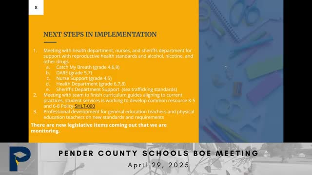 Bell schedule: staff proposed a three‑tier bell schedule for the Topsail High feeder pattern after a third‑party analysis. The original recommendation had middle schools at 7:30 a.m., high school at 8:15 a.m. and elementary at 9:00 a.m. Following stakeholder feedback, staff proposed moving middle schools to 7:20 a.m. (no net earlier pick‑up time for some stops) and elementary start to 8:50 a.m. with dismissal at 3:50 p.m. Staff said the small time adjustments would align middle‑school start times countywide and reduce a concentration of traffic in a small area. The board was asked to consider the item for an action vote in May.
