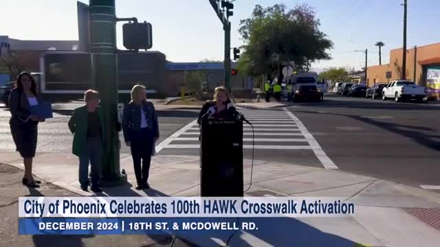 Mayor Kate Gallego and city officials marked activation of Phoenix’s 100th HAWK (High‑intensity Activated Crosswalk), citing pedestrian safety gains and a Vision Zero commitment; city staff said the device type was approved by the Federal Highway Administration in 2009.