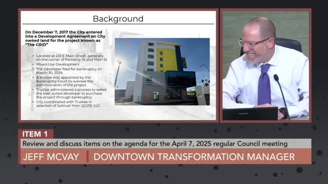 City staff briefed council on a proposed memorandum of understanding with purchaser SoulTrust for the stalled “Grid” mixed‑use project at 233 E. Main St.; staff said the city will execute an agreement negotiated by the bankruptcy trustee and noted remaining contractor claims and required bankruptcy‑court approval.