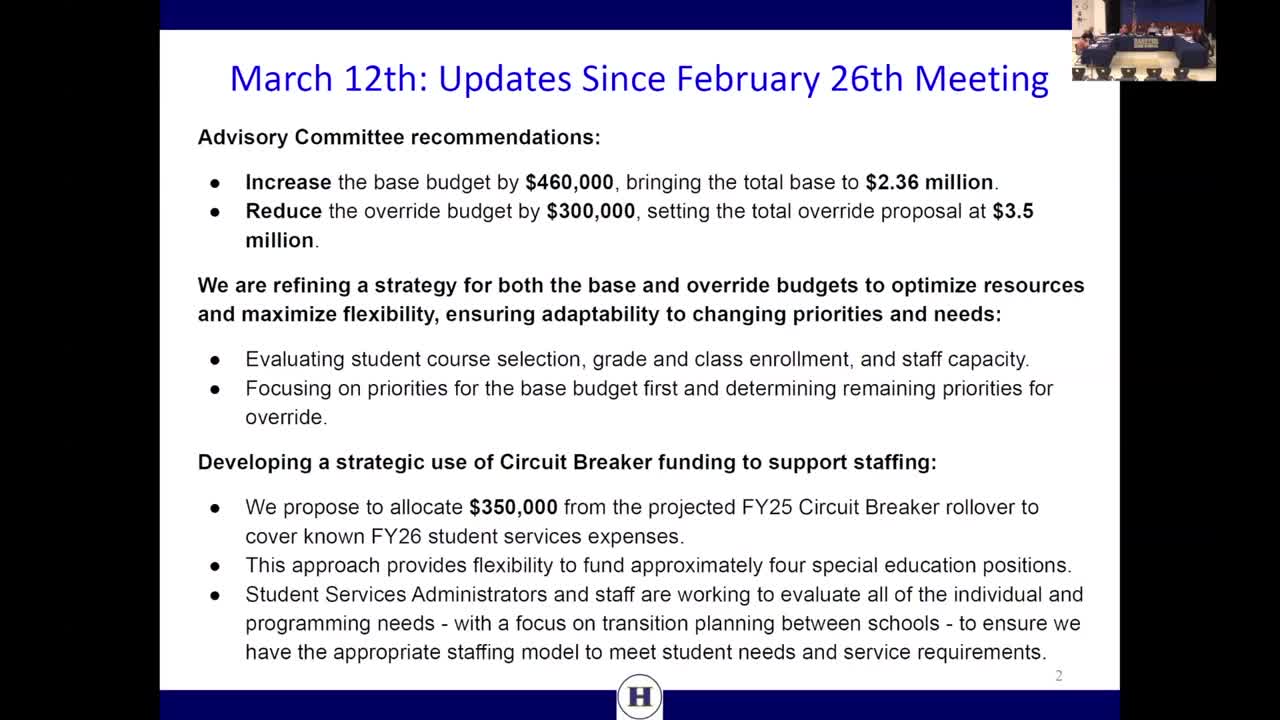 Superintendent and finance staff said the advisory committee recommended boosting the base budget by roughly $960,000 above level services, bringing the total base increase to under $2.4 million. Administrators described using an anticipated circuit breaker rollover from FY25 into FY26 (they estimated rolling roughly $500,000–$800,000 and proposed allocating $350,000 of that rollover now) to fund high‑priority student‑facing positions (speech/language, BCBA, special‑education teacher, district reading teacher) and to reduce reliance on one‑time reserves.