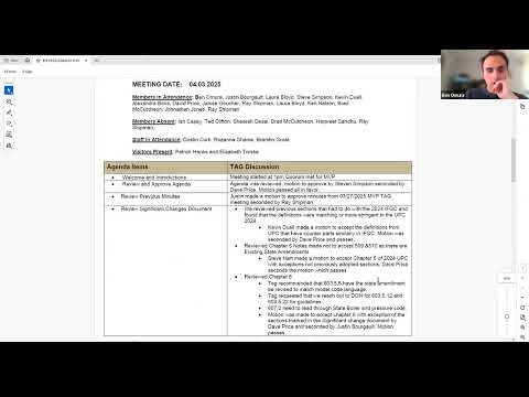 - Follow-up code-change proposals and schedule: Staff confirmed the public code-change proposal window will open the week following the tag meeting (staff cited an April 18 opening in the meeting) and is expected to close on June 16, with a council meeting on or about June 20. Tag members were told they can submit code-change proposals (the tag itself may be listed as proponent) and staff will circulate guidance and the SBCC code-change form. Brandon (SBCC staff) said the code‑change form and guidance will be posted and circulated to the tag.