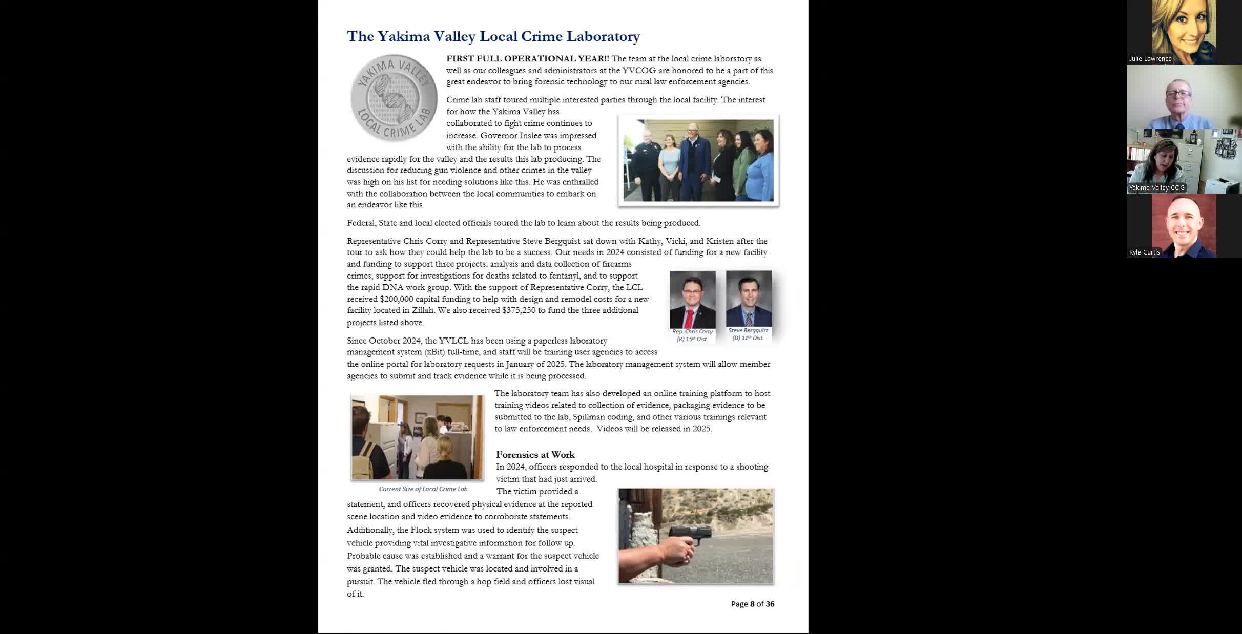 Yakima Valley Conference of Governments told Yakima County commissioners its regional crime lab completed a first full year of operations, produced high NIBIN lead rates and started a statewide rapid-DNA work group, and that staff are seeking larger, permanent lab space.