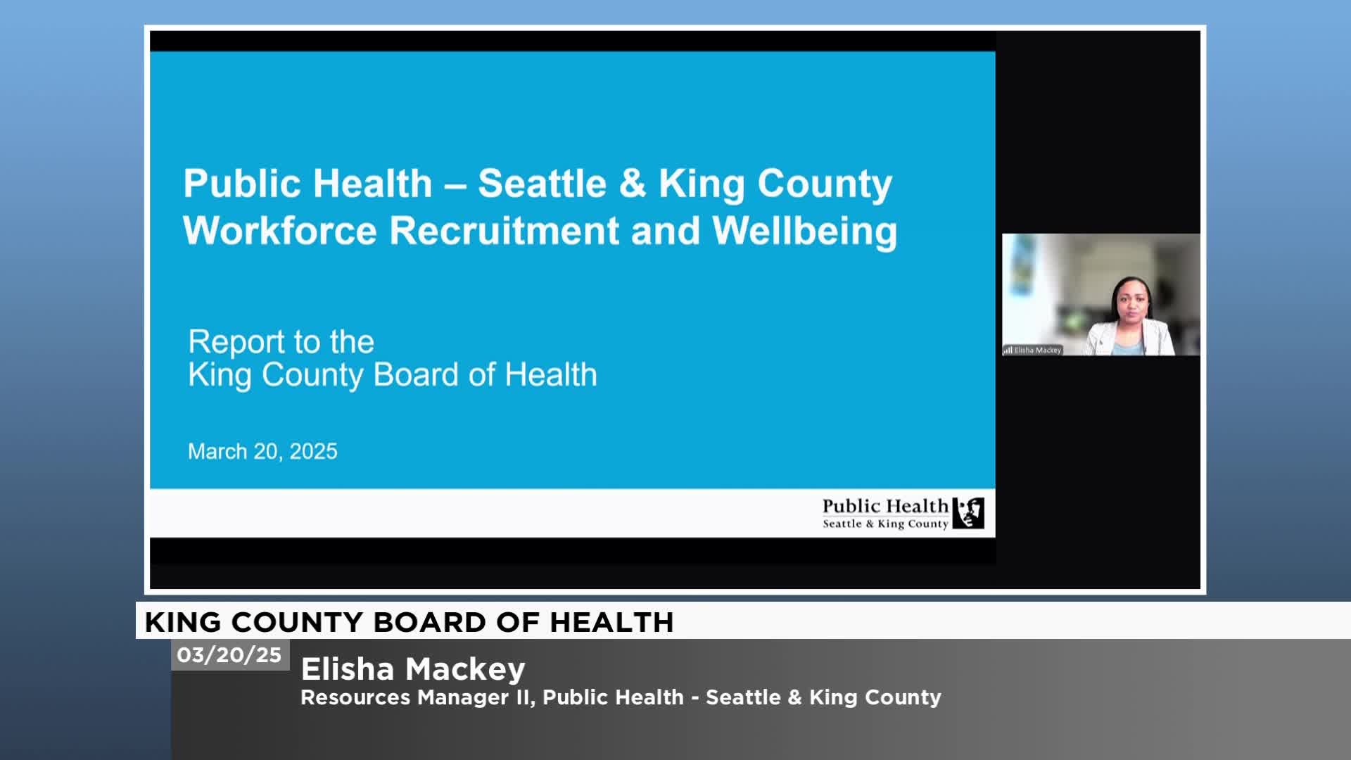 Public Health — Seattle & King County on March 20, 2025, briefed the Board of Health on a multi‑phase initiative to improve recruitment, hiring equity and staff well‑being and received comments from nursing union representatives who described staffing losses and the consequences for clients.