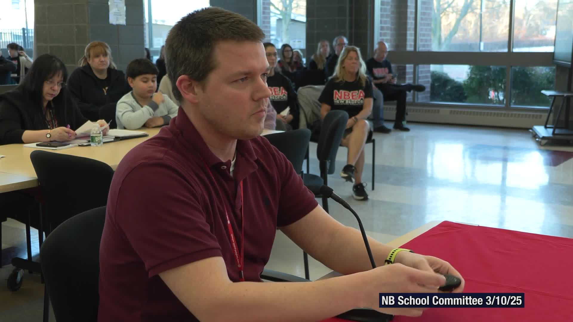 Rayner flagged a long‑term facility need at New Bedford High School: a larger band room and field improvements. He said the band program’s equipment needs and overlap with athletics currently force rehearsals into gym space and limit marching rehearsals. When asked about turf costs, Rayner and a committee member said a turf field could be about $1 million and explained drainage and soil issues may make turf a more practical solution than interim blacktop.