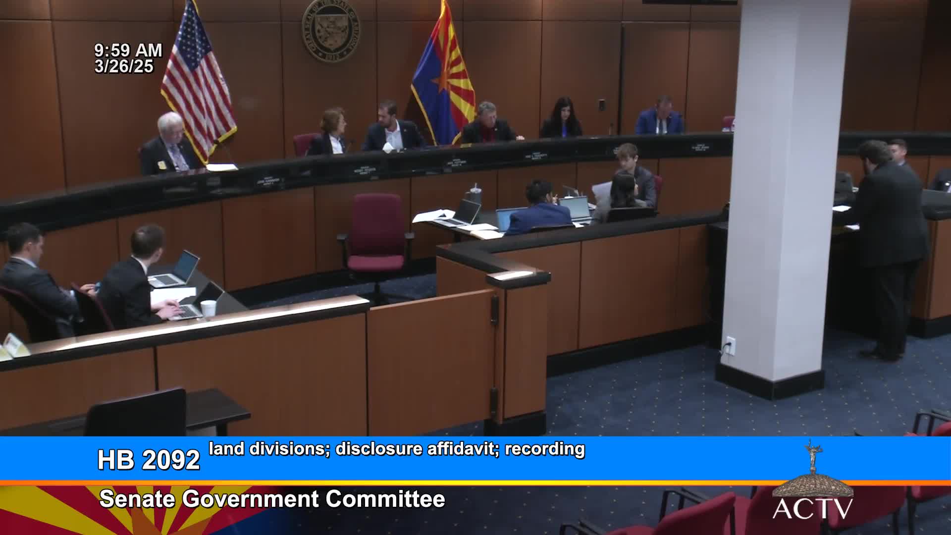 The Arizona Senate Government Committee on March 25 advanced a slate of bills affecting property disclosures, small land subdivisions, procurement restrictions for companies domiciled in China, open-government rules, and limits on post-commission employment.