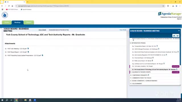 At the March 20 meeting the district’s representative on the York County School of Technology (YCST) Joint Operating Committee summarized the ongoing feasibility study and asked board members to review the materials ahead of the next JOC meeting.