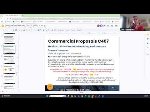 C407 renewables crediting: Elizabeth proposed simplifying the complex renewables credit table in C407 by reverting to a single, average allowable percent contribution (for example, a simple percentage consistent with ASHRAE Appendix G practice) rather than a complex, climate‑zone‑and‑occupancy table. The board voted in favor of the approach (14 yes, 0 no, 4 abstain) and directed staff to return with a recommended single percentage (or climate‑zone adjustments, if warranted) that aligns with C406 credits and ASHRAE protocols.