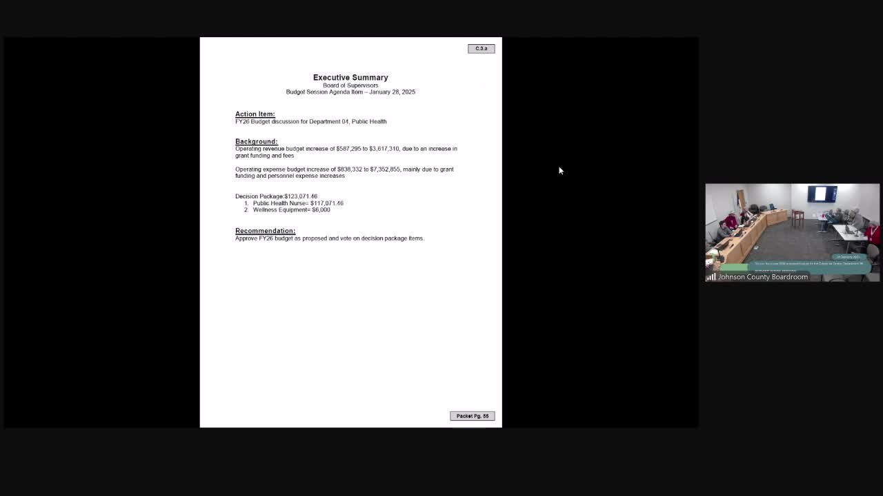 Johnson County Public Health presented its proposed FY2026 budget asking for an additional public-health nurse and continued ARPA-funded positions, citing increased WIC caseloads, rising tuberculosis costs and new grant opportunities that expand service demand.