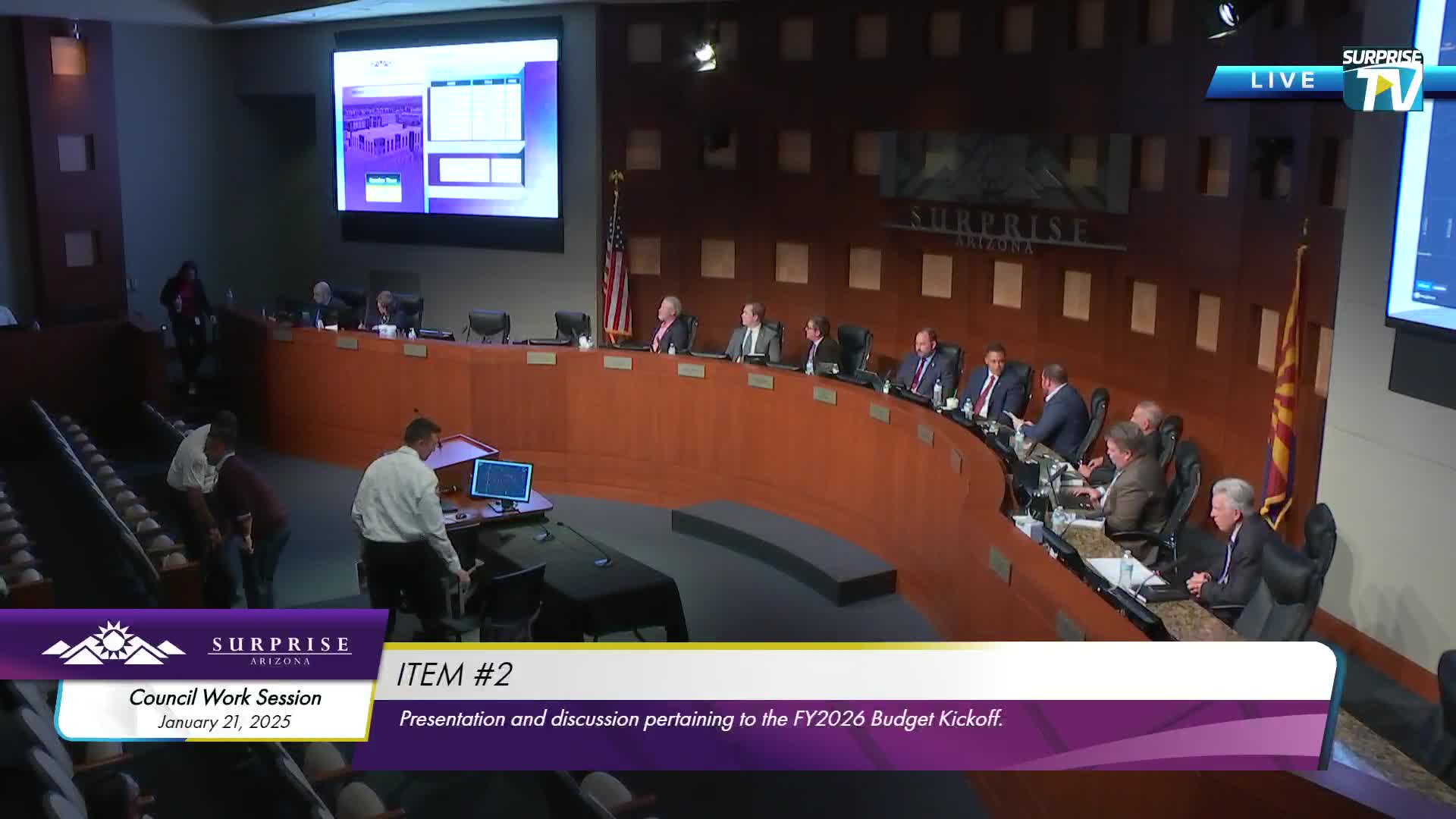 City of Surprise staff on Jan. 21 kicked off the fiscal year 2026 budget process, outlining the city's budgeting approach, state filing deadlines and the link between council strategic priorities and departmental budget requests.