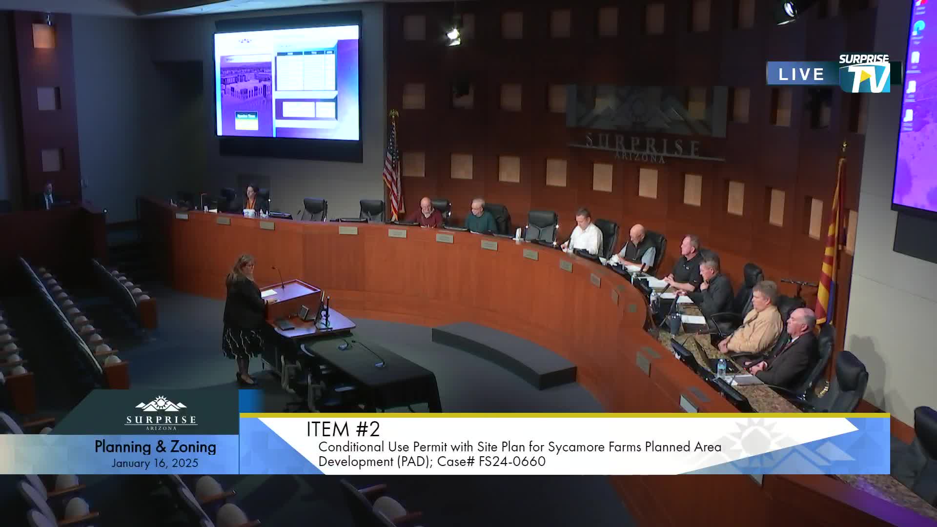 The City of Surprise Planning and Zoning Commission approved a conditional use permit and site plan for a roughly 3,500‑square‑foot drive‑through restaurant in the Sycamore Farms Planned Area Development, with commissioners pressing staff to address pedestrian safety and circulation.