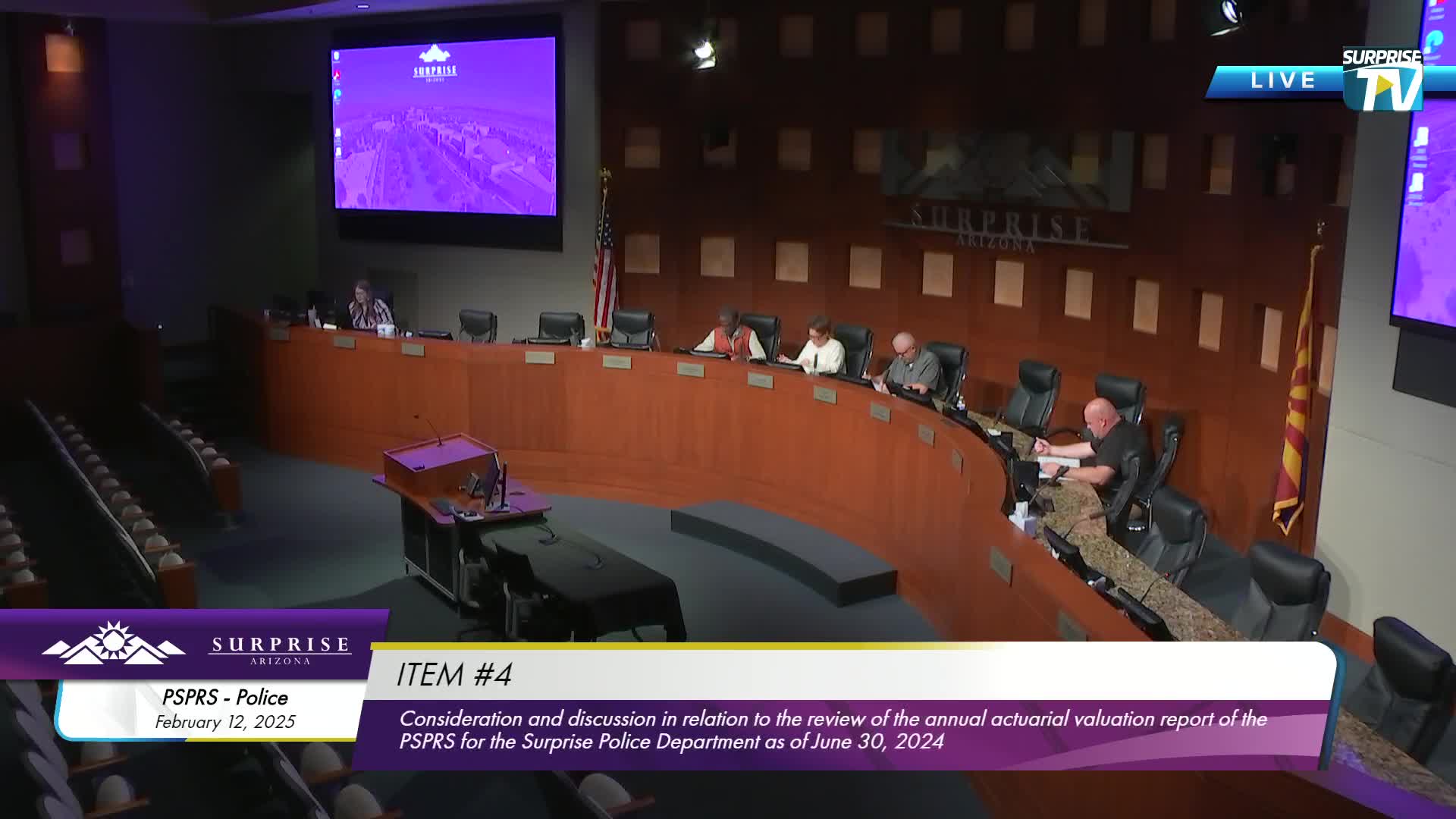 The Surprise Public Safety Retirement Commission on Feb. 12, 2025, asked actuaries from the Public Safety Personnel Retirement System (PSPRS) to appear before the commission and explain the annual actuarial valuation for the police and fire plans as of June 30, 2024.