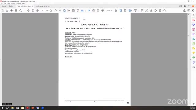 The Kane County Development Committee on Wednesday rejected a request to rezone a subportion of 4-656 (JW McConaughey Properties LLC) from B3 to B4 to permit on-site sale and consumption of alcohol and video gaming at a vacant 875-square-foot tenant space proposed as “Cafe Parlay.” The motion to approve the rezoning, moved by Commissioner Iqbal and seconded by Commissioner Leonard, failed on a 2-3-1 vote: Iqbal and Commissioner Berman voted yes; Commissioners Doherty, Garcia and Leonard voted no; Chair Richard Williams recorded an abstention.