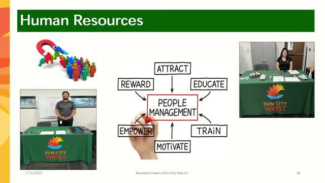 HR Director Kirsten Peterson said the HR team of three manages nearly 500 employees, completed 22 hires (48% residents), ran extensive training including active-shooter and AED/CPR, and reported average employee tenure of seven years at Sun City West rec centers.