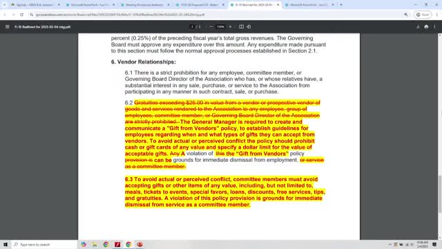 Committee member Chris (presenting a redline) proposed changes to FI10 during the Feb. 4 meeting that would remove employee gift rules from FI10 and require the general manager to adopt a vendor‑gift policy in the employee handbook.