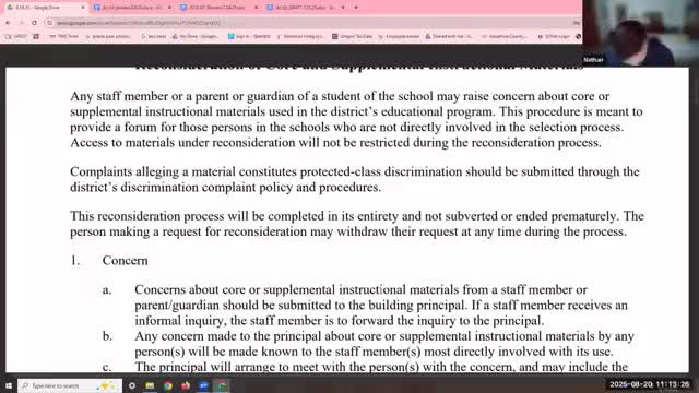 The board reviewed administrative regulations for reconsideration of curriculum, classroom and library materials and debated committee composition and impartiality safeguards. The draft ARs set a committee of up to nine members, including district staff, and up to four parent/guardian volunteers randomly selected by the superintendent’s designee. Several trustees raised concerns about impartiality if the staff member who originally selected the material served as a voting member of a reconsideration committee. Board member Nathan said impartiality and due process require removing a decision-maker from the final adjudication. Staff and trustees discussed an approach where the staff person who chose the material still participates as a resource but does not vote: "they may serve on the committee, but not as a voting member," a board member summarized. The group also discussed whether reconsideration proceedings must be public under recent legislation (reference in meeting to SB 1098) and noted that an appeal ultimately can come to the board, which provides a separate public review. The draft process calls for resolving issues at the lowest level (teacher or library manager), with steps to escalate to the principal and then to a district-level reconsideration committee if needed. Why the board is acting: the district is formalizing a consistent, transparent process for resolving complaints about instructional and library materials and ensuring due-process protections. Direction: staff will revise AR language to specify that personnel who made the original selection may serve in an advisory or non-voting capacity on reconsideration committees and to clarify volunteer selection and committee composition; staff also will ensure clear public-meeting guidance for any committee actions as required by law. Ending: Staff agreed to adjust the AR language to ensure impartial committee decision-making and to return with updated text.