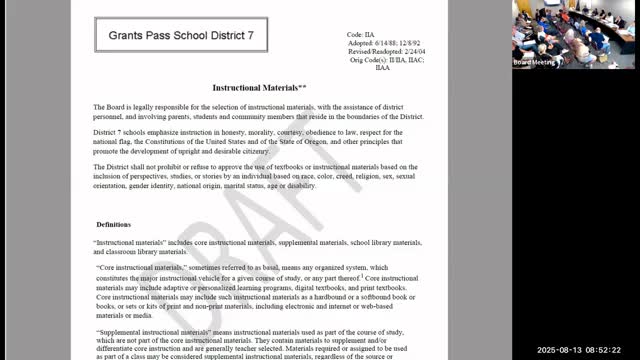 The Grants Pass School District 7 board directed the superintendent to report back on Oct. 1 with a research brief on the cost and projected timeline to implement an independent adoption of health instructional materials consistent with applicable OAR procedures. The direction followed extended discussion about whether to select state‑approved materials, pursue an independent publisher adoption, or consider a locally created curriculum.