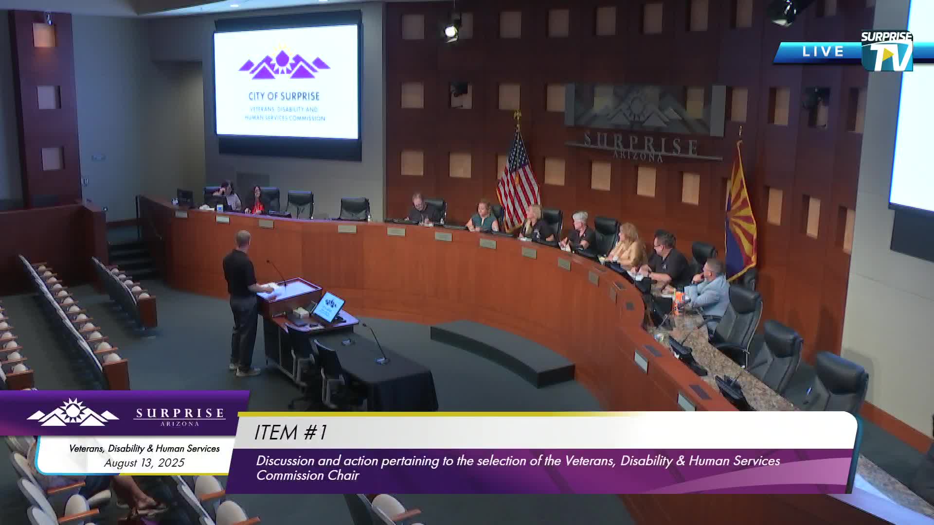 The Surprise Veterans Disability and Human Services Commission selected Michael Tree as chair and Kent Partridge as vice chair in public ballots during the Aug. 13 meeting. Both selections passed by voice/roll-call vote; staff explained eligibility rules under city code.
