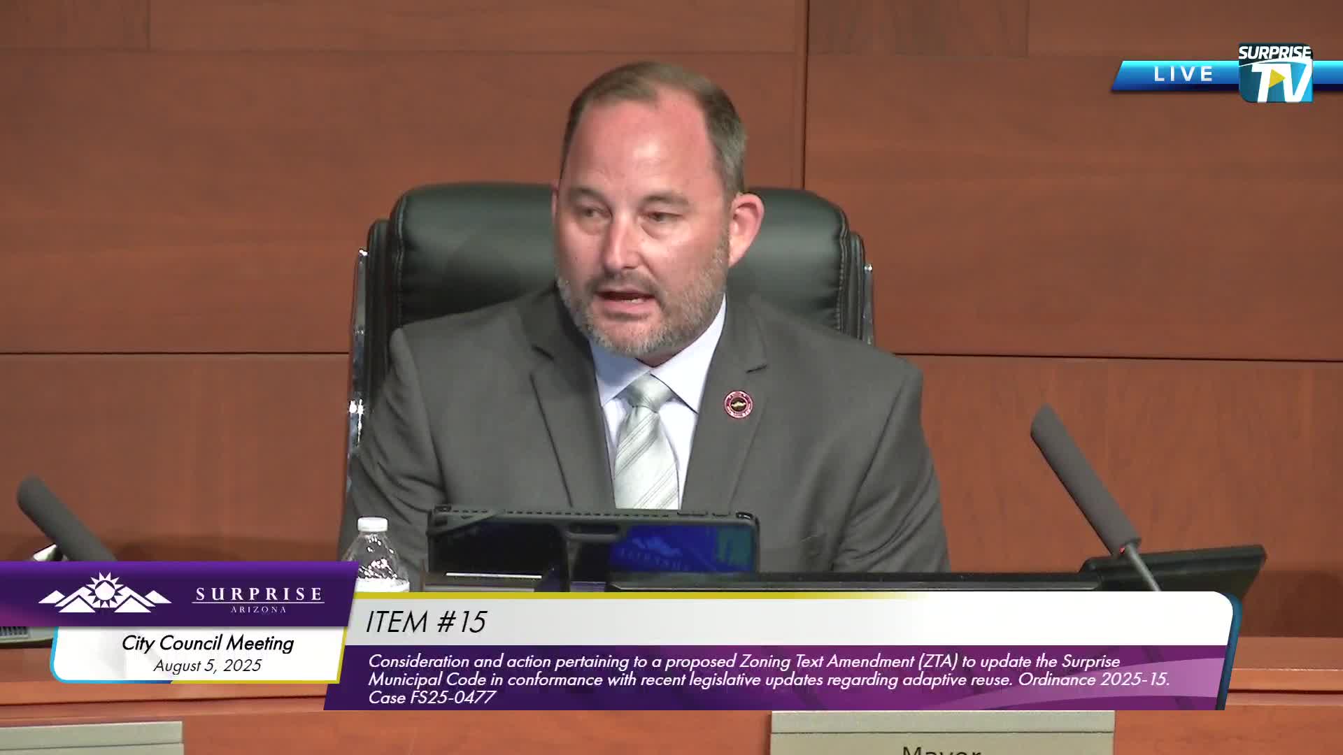 The Surprise City Council approved a comprehensive sign program (Case FS24-1219) on Tuesday for the Tricolor Auto Arizona development at the northwest corner of Cactus Road and Summit Way. The Planning and Zoning Commission had recommended approval with stipulations; council voted in favor by voice vote. City staff said the proposal includes a 15-foot, Class 6 monument sign on Cactus Road and multiple building-mounted signs that comply with dimensional standards. The site also includes up to eight building-mounted blade signs that meet size limits but exceed the local limit of one blade sign per building, for which the comprehensive sign program requests a deviation. Councilman Greenberg said the package felt "too much for one building" and signaled he intended to vote against the program on aesthetic grounds, but the council approved the program on a majority voice vote. The applicant’s sign permits for the monument and some building-mounted signs have already been issued and those signs are installed on site, staff said. Why it matters: The decision sets a precedent for sign deviations in an industrial area near planned commercial parcels and may guide future sign programs for large industrial or corporate-branded facilities. What happens next: With city approval of the comprehensive sign program and issued sign permits for some elements, construction and installation may continue in accordance with the approved stipulations.