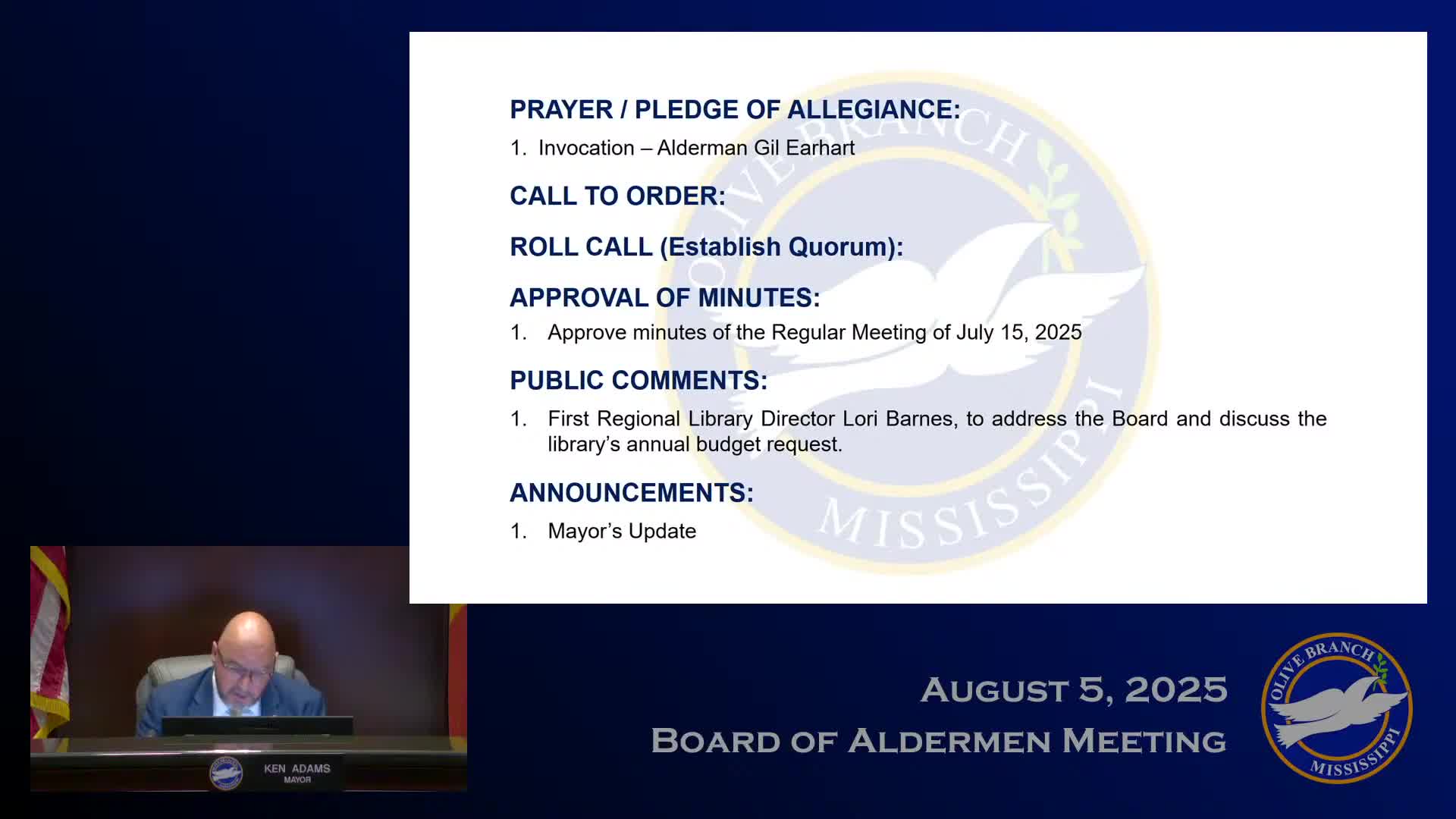 Lori Barnes, director of First Regional Library, told the Olive Branch Board of Aldermen on Aug. 5 that the system recorded heavier use over the past year and asked the city to maintain funding at $432,600 for fiscal year 2026 to keep current service hours and programming.