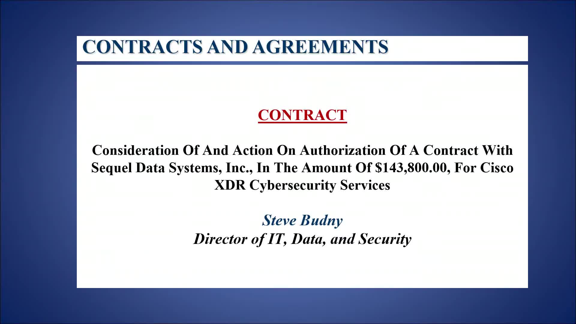 The council approved a $143,800 contract with SQL Data Systems Inc. to expand Cisco XDR services; staff said the purchase uses federal Infrastructure Investment and Jobs Act grant funds and completes a multi-year grant-funded cybersecurity enhancement, though this portion carries a 10% local match.