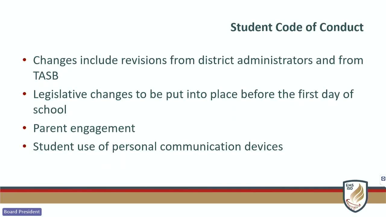 The Eagle Mountain Saginaw Independent School District Board of Trustees approved a revised student code of conduct on July 28 that incorporates legislative changes and recommendations from TASB.