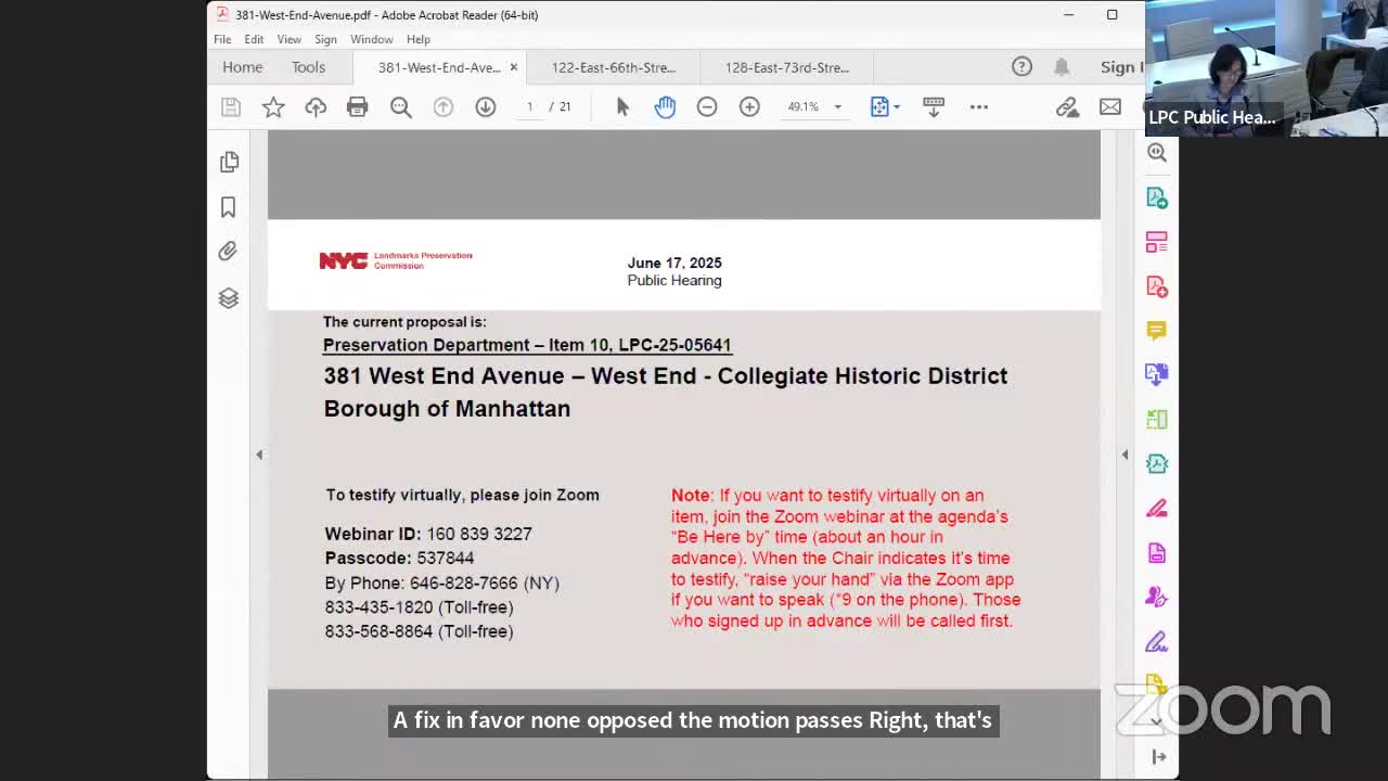 The commission approved legalization of a rebuilt secondary west façade at 381 West End Avenue in the West End Collegiate Historic District, finding the reconstruction compatible with the row and requiring the applicant to work with staff on coping and rooftop-edge details.