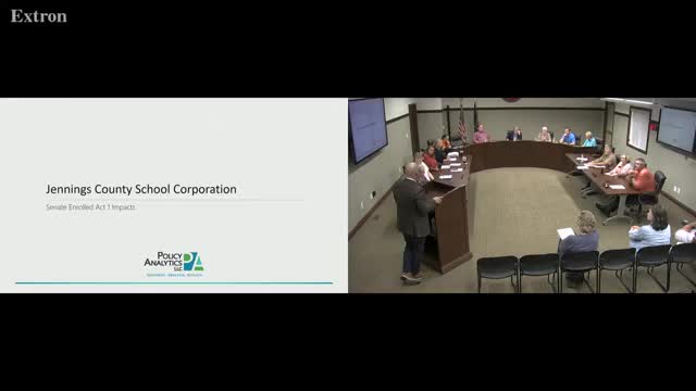 Barry Gardner of Policy Analytics told the Jennings County School Corporation work session that Senate Enrolled Act 1 will reduce net assessed value, constrain operations-fund revenue and raise tax rates even where district revenue is flat; the district faces an estimated $2 million gap beginning in 2028 under current assumptions.