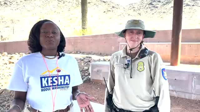 Park rangers at South Mountain Park and Preserve in District 8 demonstrated trail work and urged visitors to prepare for desert hikes by carrying ample water, wearing closed-toe hiking shoes, applying sunscreen and carrying basic safety gear. Esther, a Phoenix park ranger, led the demonstration and described both safety items and trail maintenance tasks.