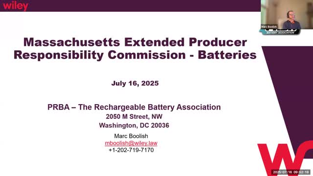 Commissioners heard a PRBA presentation describing a model bill for small‑ and medium‑format batteries (portable lithium‑ion, e‑bike packs and similar consumer batteries), municipal data on current collection activity and a detailed fire‑safety briefing from the Massachusetts Department of Fire Services. No final action was taken; commissioners instructed staff to capture the comments, solicit written input and return with a refined recommendation at future meetings.