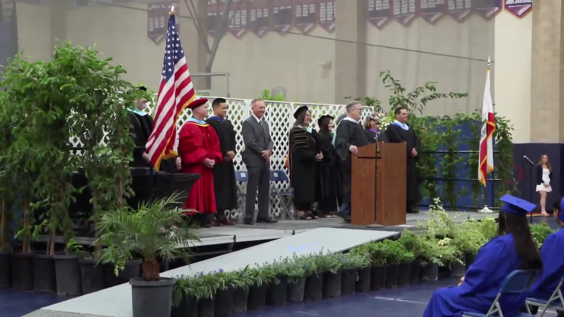 The ceremony included announcements of individual graduates by school groups; administrators and district cabinet members were introduced onstage, including assistant superintendents Jordan Aquino, Dr. Joseph Hyde and Laura Fisher, and senior directors Dr. David Gustafson and Jason Mills. Principals representing summer and regular programs were acknowledged, and the La Quinta High School Air Force Junior ROTC presented the colors.
