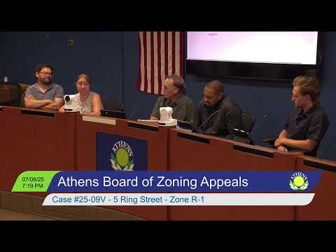 The Athens Board of Zoning Appeals approved a variance to allow a permanent wood storage shed to sit 2 feet from the rear property line and 1.5 feet from the left side at 5 Ring Street, finding the lot's small, triangular shape created practical difficulty under Athens code.