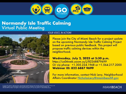 The meeting on the Normandy Isle project was led by O'Neil Rodriguez, assistant director of the Transportation and Mobility Department, who said the team “heard your concerns” and “redesigned a lot of the devices to minimize as much as possible the impact to on street parking.” The update summarized device changes, parking impacts, coordination with Florida Department of Transportation projects on 70th Street/Normandy Drive, and next steps for property‑owner outreach and county approvals.