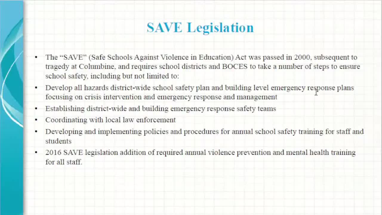 Byrd reviewed changes and additions the district must reflect in the plan: legislation since Columbine that requires district and building emergency response plans and teams, coordination with local law enforcement, and annual violence‑prevention and mental health training for staff. He said districts were required in recent years to add public‑health continuity plans, emergency remote instruction plans and requirements to conduct drills in a trauma‑informed, developmentally appropriate manner. "Those plans are confidential, not subject to disclosure under article 6 of the public officers law," Byrd said.