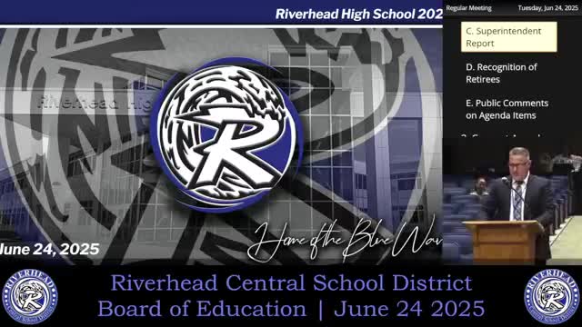 The accomplishments include athletics and arts highlights that school staff presented as part of the year-end report. Baseball coach Kevin Kerman noted sophomore pitcher Matthew Zambriski threw “Riverhead Baseball's first perfect game in school history,” while praising senior Brady Hubbard’s playoff-winning hit. Girls golf coach Steve Faella said two Riverhead players qualified for the New York State championships for the first time in district history. The principal said the district again qualified as a school of excellence, with 23 of 25 varsity teams meeting standards.