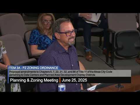 On June 25, 2025, the City of Mesa Planning and Zoning Board voted 6‑1 to recommend amendments to the city code regulating data centers, advancing the proposal to City Council for introduction July 1. The measure adds a definition for "data center," sets development standards and setbacks, and establishes a waiver process for some properties.