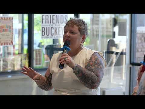 An artist described a new public sculpture made from roughly 300 discs, each bearing quotes collected from a survey of readers; the artist discussed design choices, the meditative process and the project’s aim to uplift passersby.