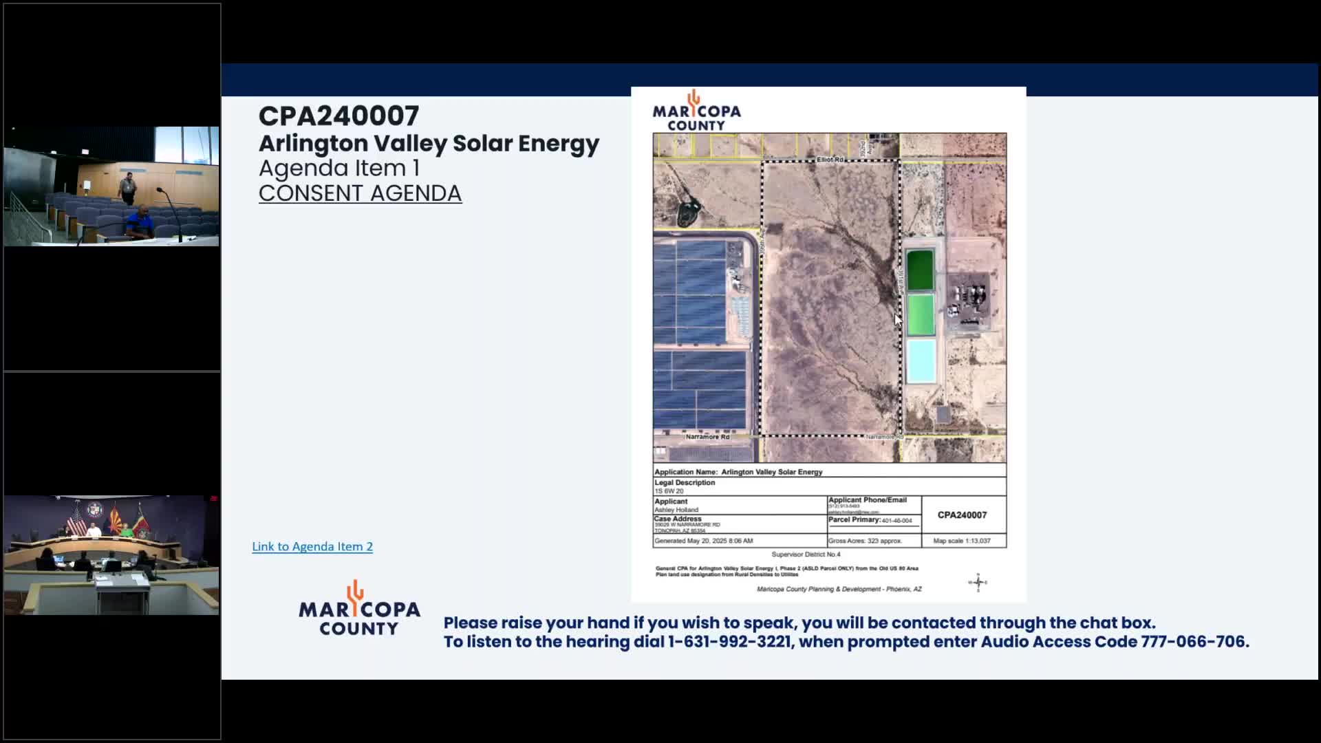 Staff summarized key consent items. For Arlington Valley Solar (CPA240007), staff said the request is a comprehensive plan amendment to change the land-use designation in the Old U.S. Highway 80 area plan from rural residential to industrial; a companion zoning case (Z240025) seeks a zone change with overlay from Rural-190 and Rural-190 Special Use Permit to Industrial IUPD, and staff recommended approval with conditions a through w. For SU250001 (Northern And Cotton Storage), staff described a special use permit for RV storage in a C-2 CUPD zoning district at the northeast corner of Northern Avenue and Cotton, recommending approval with conditions a through i. For SU250005 (NJ Palmer Salon), staff said it is a special use permit for a home-occupation in the Rural-43 zoning district about a quarter mile west of the southwest corner of Queen Creek Road and Higley; staff recommended approval and noted written opposition had been received but no speakers were present. For SU250018, staff said it seeks modification of conditions to extend the validity timeframe for interim outdoor industrial storage at 1011017 West Happy Valley Road (southeast corner of Happy Valley Road and 11th Avenue in North Phoenix); staff recommended approval with conditions a through h.