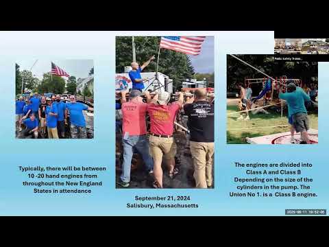 Committee discussion and Falcone’s presentation detailed the event format and logistics. A typical hand‑engine entry receives 15 minutes of competition time; Falcone estimated the muster would likely run from about noon to mid‑afternoon (roughly noon to 3–4 p.m., depending on the number of entries). He said participants historically compete to produce the longest water stream on a 300‑foot course and noted prize money and trophies help attract out‑of‑town teams. Falcone also described needs the town would help coordinate: a PA system, police detail for crowd control and traffic, access to water (some towns use hydrants with meters), and field setup; he suggested Choate Field as a likely venue.