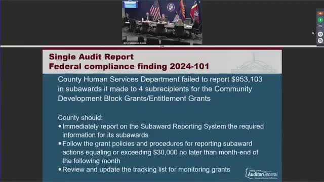 Auditors found that the county's Human Services Department failed to report required subaward details for roughly $950,000 in Community Development Block Grant subawards; Human Services officials said the omission was an oversight and that required information was reported in February 2025.