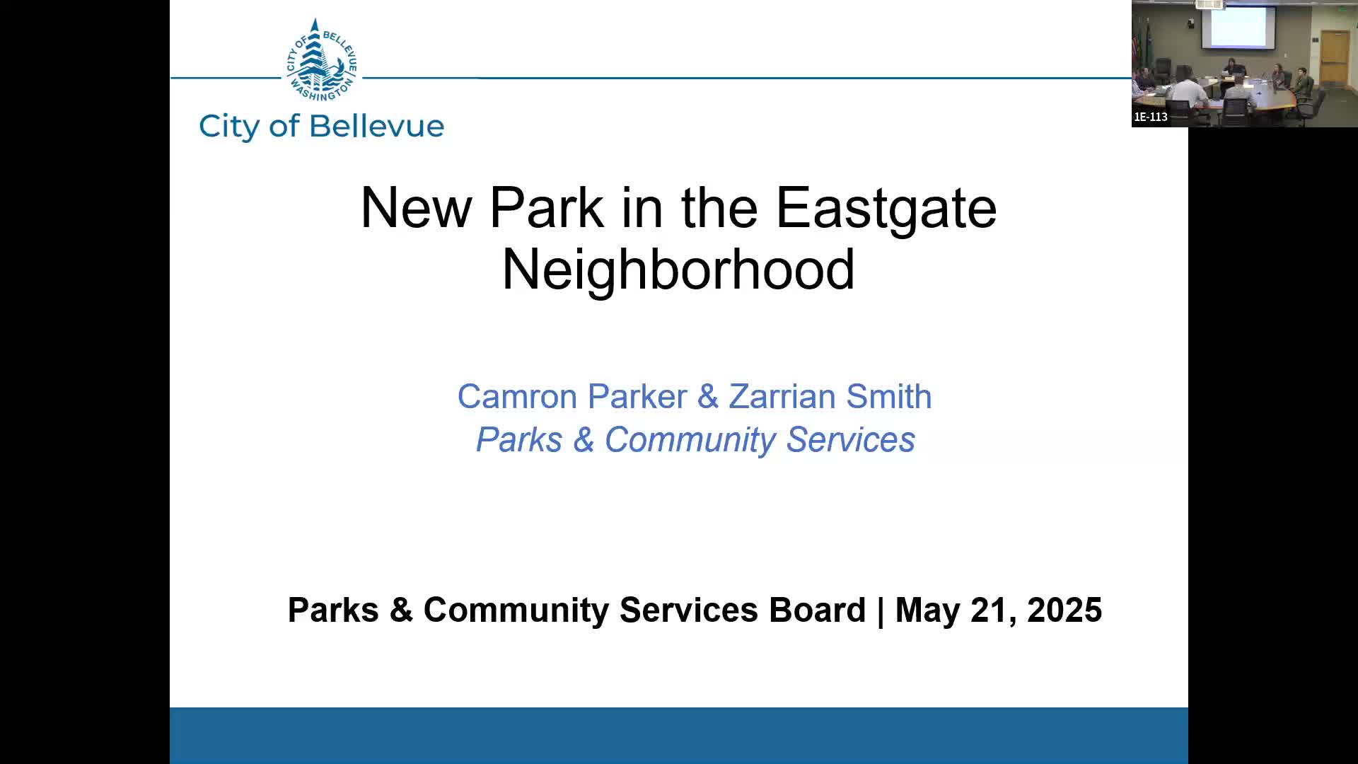 The project aims to fill a park‑access gap south of I‑90 in the Eastgate area and advance a neighborhood park that reflects local preferences. Staff emphasized that no formal Parks Board action was requested at the May meeting; the board heard the mid‑design update and asked questions to inform future design steps.