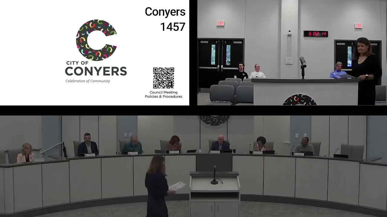 The Conyers City Council opened and closed a public hearing on the proposed 2025–26 balanced budget; staff said the budget is available for inspection and the council will consider a second reading and adoption at its next meeting.