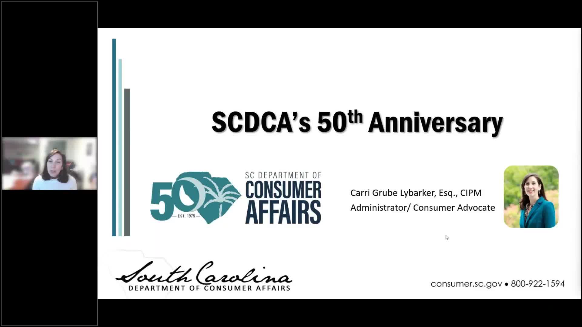 As part of the fiftieth-anniversary observance, Lybarger said the department has a new logo, will publish a commemorative journal and a video, and plans to release a revised mission and vision statement. She closed the webinar by providing contact information and instructions for requesting free presentations or ordering publications via the agency website and email (scdca@scconsumer.gov).
