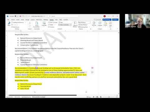 Committee members proposed several process clarifications: require (not just encourage) the Select Board to create the committee; include staff/professional representation to maintain continuity; and include language requesting the implementation committee be added to distribution lists for development proposals affecting the harbor. Kim indicated staff will prepare a redlined draft of the plan and a background section for committee review, with an expectation that the committee review those revisions a week in advance of the next meeting.