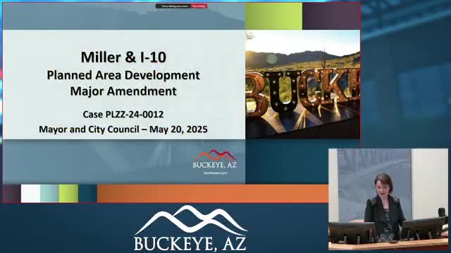 The Buckeye City Council on May 20 adopted Ordinance 19‑25 approving a major amendment to the Miller and I‑10 Planned Area Development (case PLZZ‑24‑0012), changing the permitted uses and development standards for an approximately 29‑acre site at the southeast corner of Miller Road and Interstate 10.