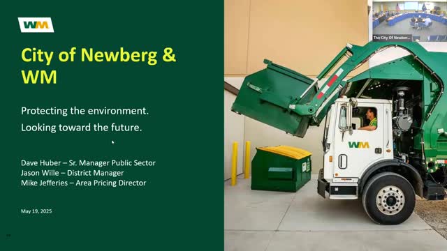 A motion to approve an 8.6 percent rate increase for Waste Management’s Newberg franchise was moved and seconded and passed by a council majority. The motion was recorded as passing by majority (administration noted a majority vote was sufficient for administrative action). Councilors asked WM to continue local outreach and to return with any follow‑up information as requested by staff.